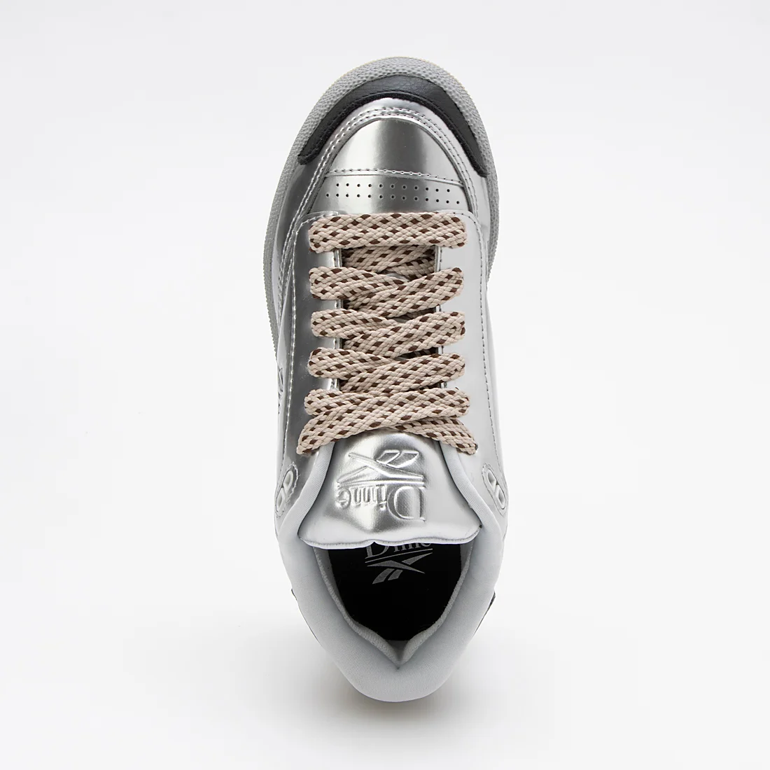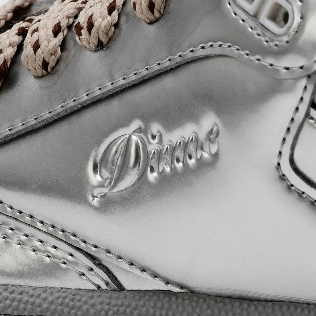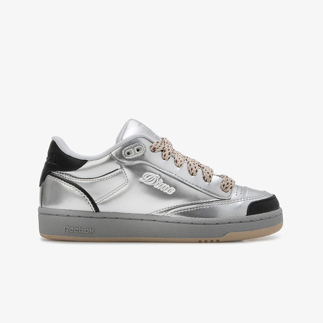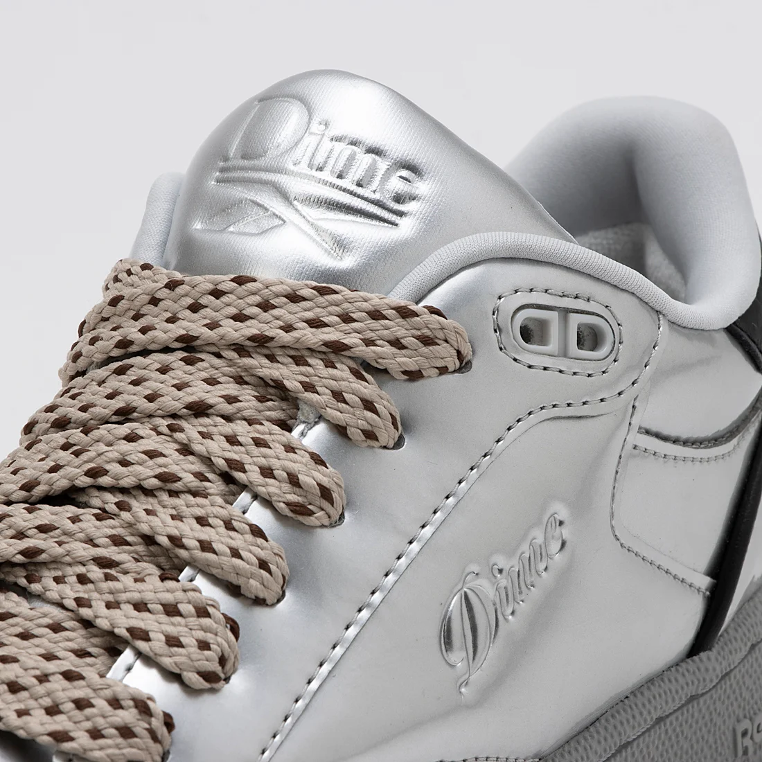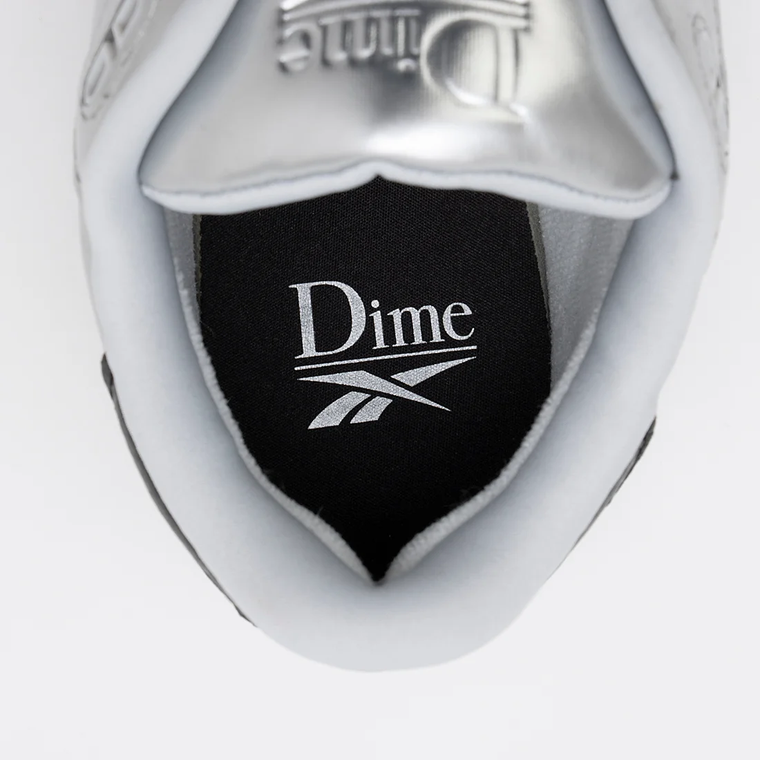 メタリックシルバーのアッパーに型押し加工されたDimeのロゴデザインが特徴。